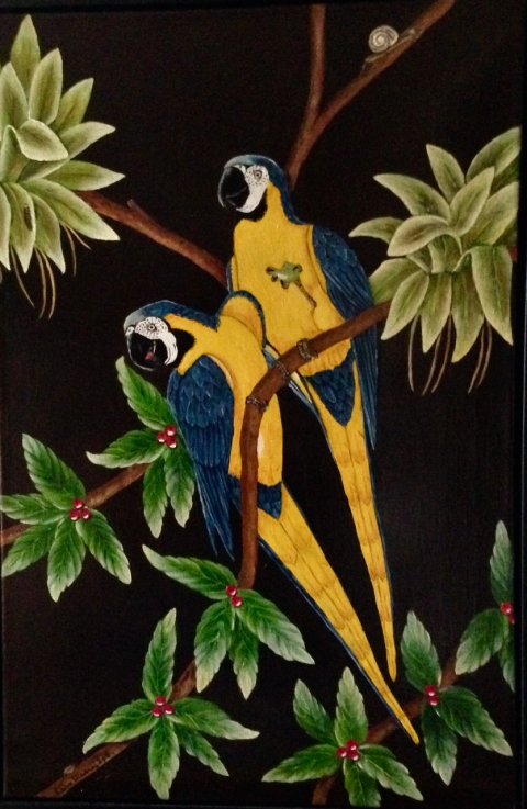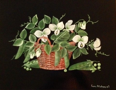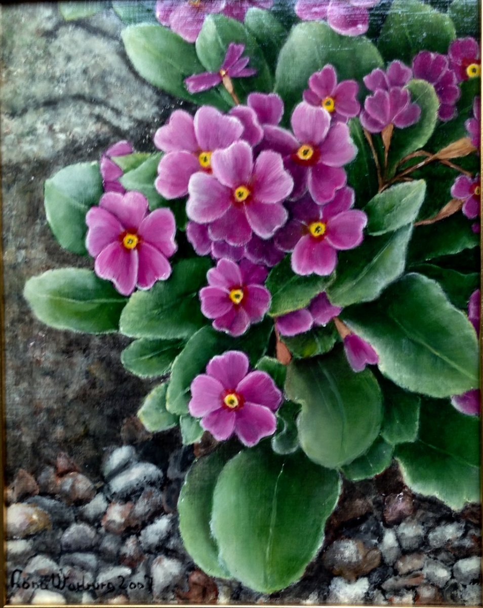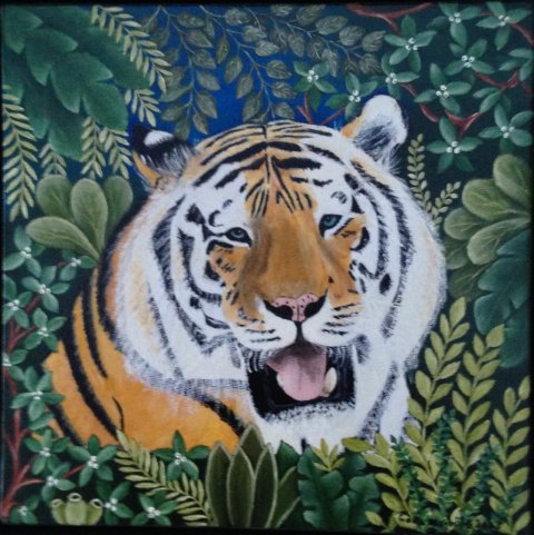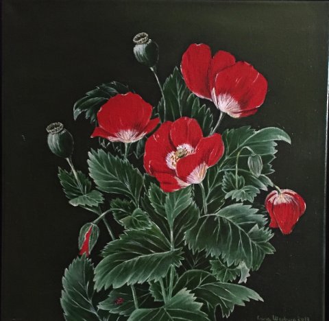 Jeg maler mest naturalistiske blomster i olie på træ eller naive dyrebilleder i olie på lærred.